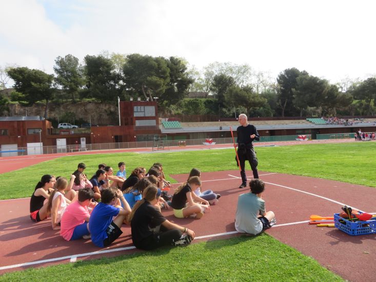 Tota Primària ens vam retrobar, un any més, a l’estadi Joan Serrahima per aprofundir i gaudir de les disciplines diverses que ofereix l’atletisme: proves de velocitat, relleus, llançament, pes, salt de llargada, tanques i llançament de javelina. Cada grup classe anava passant per les diverses estacions, on un/a mestre/a donava les instruccions corresponents.